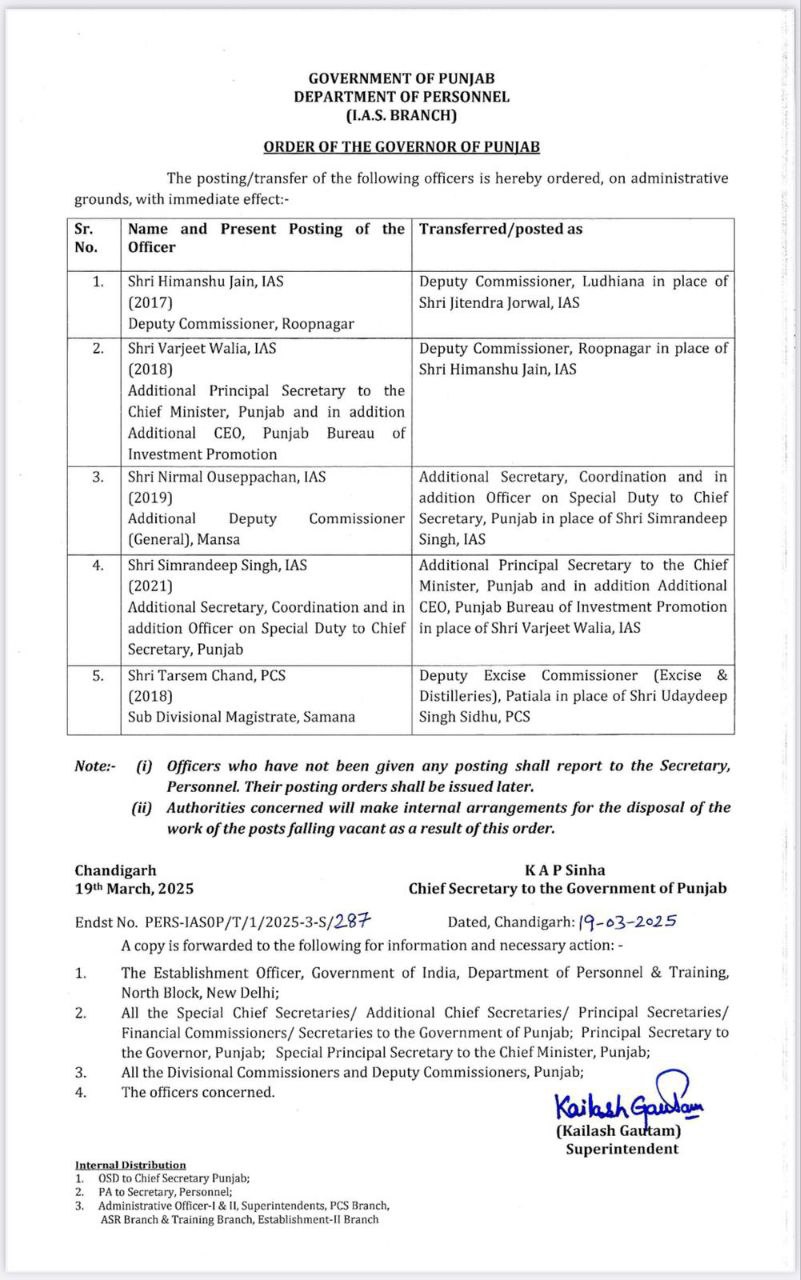 चंडीगढ़: पंजाब सरकार ने प्रशासनिक व्यवस्था में बड़ा फेरबदल करते हुए कई IAS और PCS अधिकारियों के तबादले किए हैं। यह निर्णय राज्य में प्रशासनिक कार्यप्रणाली को और प्रभावी बनाने के उद्देश्य से लिया गया है।